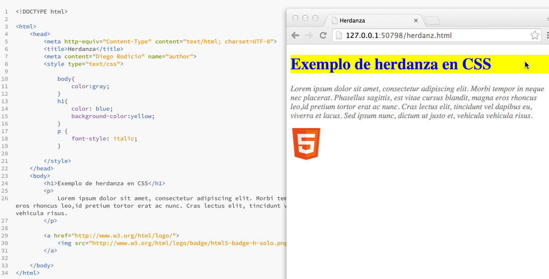 Por último, aínda que a herdanza automática de estilos pode parecer complicada, simplifica en boa medida a creación de follas de estilos complexas. Como se viu nos exemplos anteriores, se se quere establecer por exemplo a tipografía base da páxina, simplemente débese establecer no elemento<body> da páxina e o resto de elementos herdarana de forma automática.
