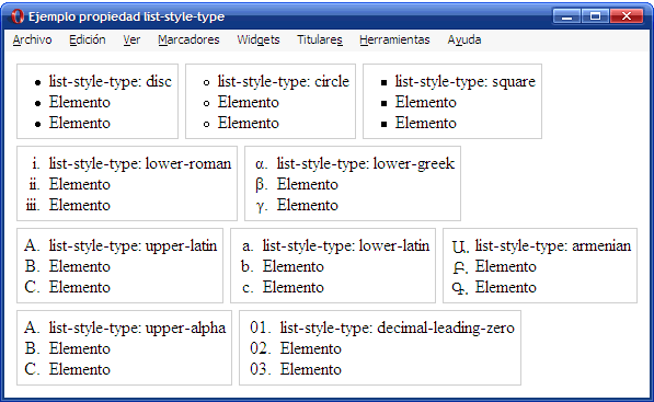 Non obstante, CSS define varias propiedades para controlar o tipo de viñeta que mostran as listas, ademais de poder controlar a posición da propia viñeta.