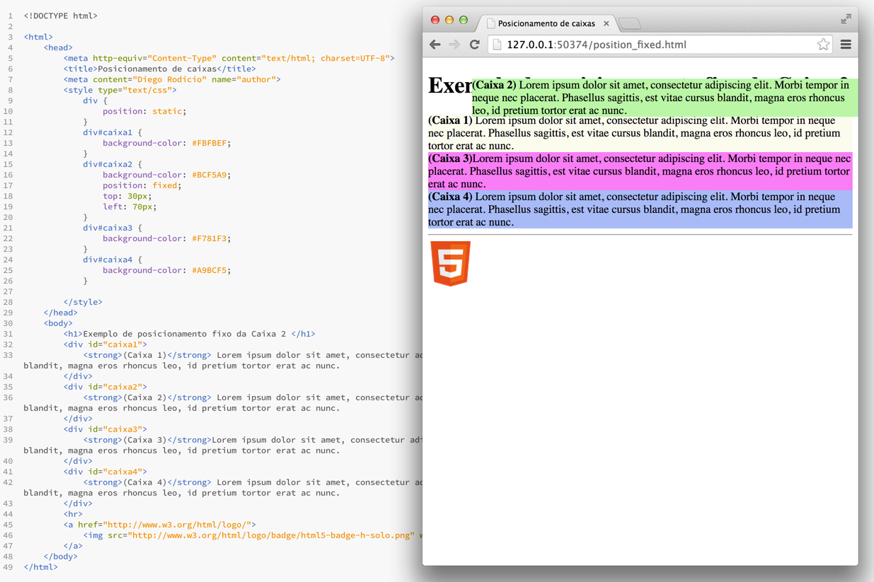Unha caixa posicionada de forma fixa é que a súa posición é inamovible dentro da ventá do navegador: O posicionamento fixo fai que as caixas non modifiquen a súa posición nin aínda que o usuario suba ou baixe a páxina na ventá do seu navegador.