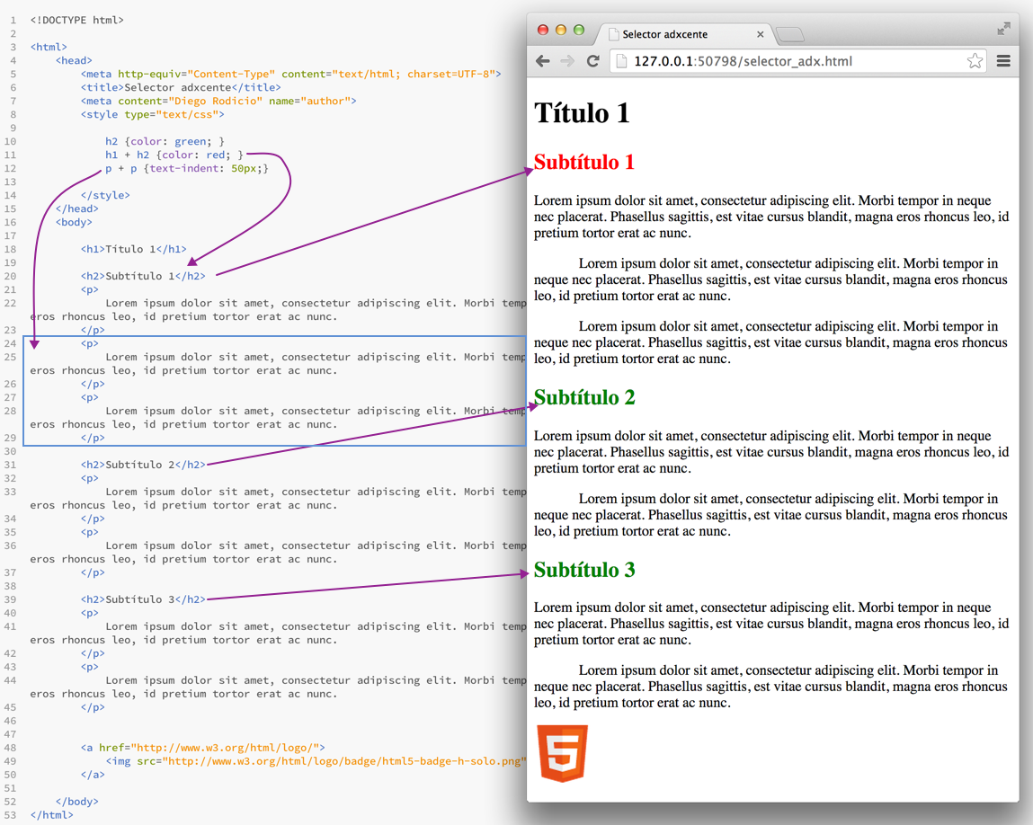 Segundo as regras CSS anteriores todos os <h2> da páxina véxanse de cor verde, salvo aqueles <h2> que se encontran inmediatamente despois de calquera elemento <h1>(Subtítulo 1) e que se amosan de cor vermella.