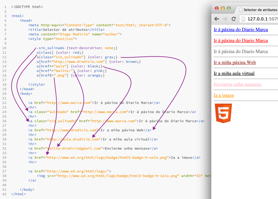 selector[nombre_atributo]: selecciona os elementos que teñen establecido o atributo chamadonombre_atributo, independentemente do seu valor.selector[nombre_atributo="valor"]: selecciona os elementos que teñen establecido un atributo chamadonombre_atributo cun valor igual a valor.selector[nombre_atributo~="valor"]: selecciona os elementos que teñen establecido un atributo chamado nombre_atributo e polo menos un dos valores do atributo é valor.selector[nombre_atributo^="texto"]: selecciona os elementos que teñen establecido un atributo chamado nombre_atributo e cuxo valor comeza por texto. Este é un selector presente a partir de CSS3selector[nombre_atributo*="texto"]: selecciona os elementos que teñen establecido un atributo chamado nombre_atributo e cuxo valor contén texto. Este é un selector presente a partir de CSS3selector[nombre_atributo$="texto"]: selecciona os elementos que teñen establecido un atributo chamado nombre_atributo e cuxo valor remata en texto. Este é un selector presente a partir de CSS3A continuación móstranse algúns exemplos destes tipos de selectores: