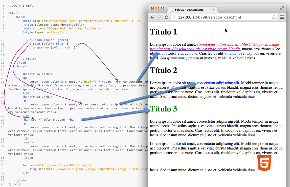 O selector descendente selecciona os elementos que se encontran dentro doutros elementos.